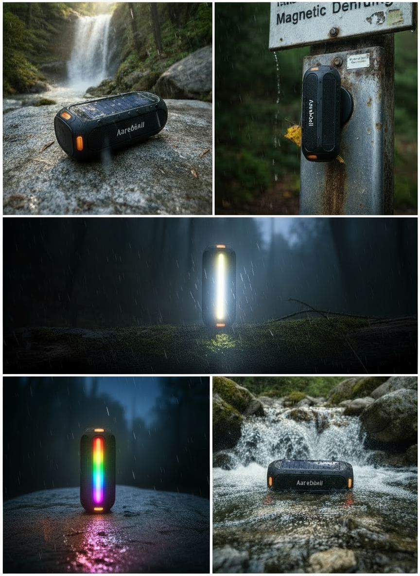 Ob unterwegs, beim Camping oder im Garten – diese Box liefert perfekten Sound, wo immer du bist. Mit Solaraufladung, wasserdichtem Design, LED-Lichtern, SOS-Funktion und starker Magnetbefestigung bist du für jedes Abenteuer gerüstet.